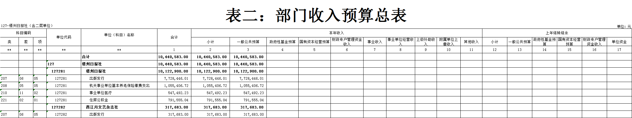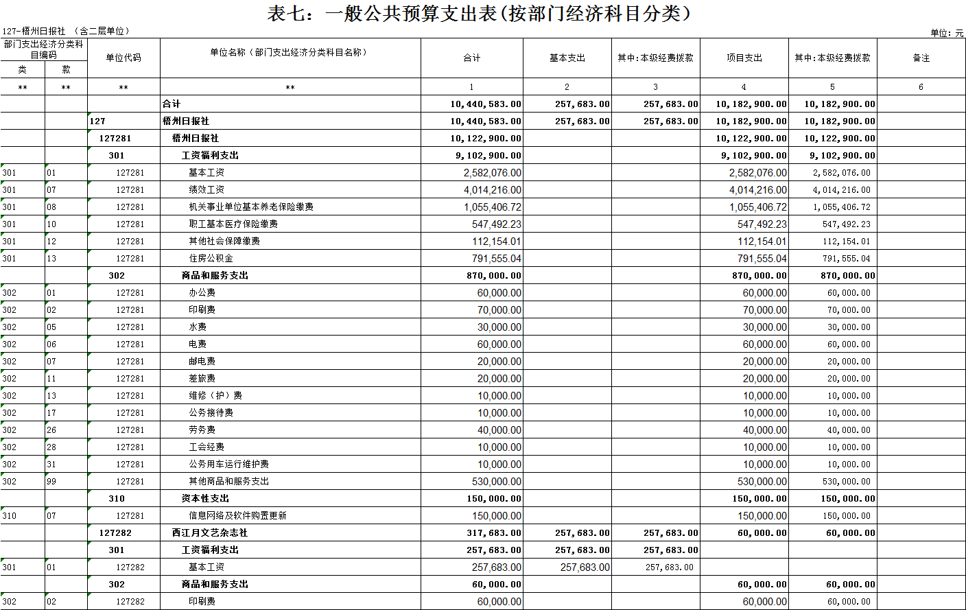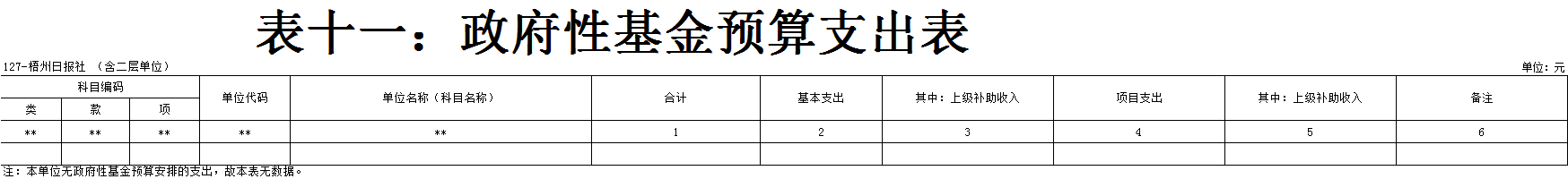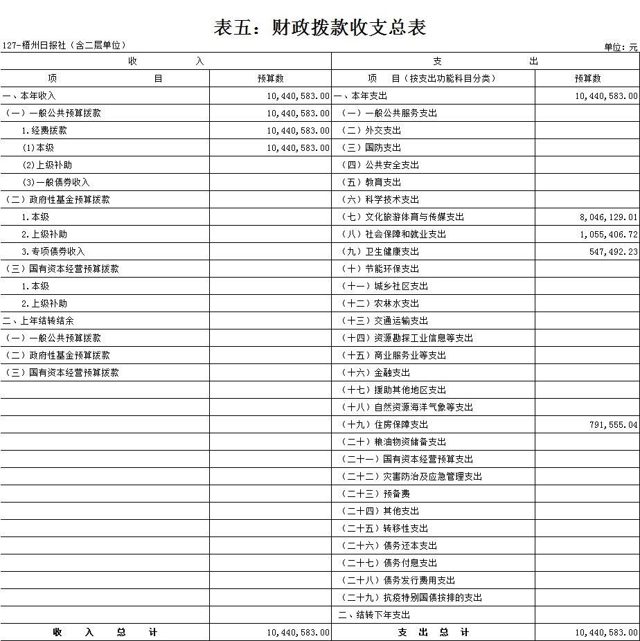 梧州日報社2021年 部門預算及“三公”經費預算情況說明 目錄 第一部分:梧州日報社概況 一、主要職能 二、機構設置情況 三、人員構成情況 第二部分:梧州日報社部門預算及“三公”經費預算情況說明 一、部門收支預算總體預算情況說明 二、部門收入總體預算情況說明 三、部門支出總體預算情況說明 四、財政撥款收支預算情況說明 五、一般公共預算支出情況說明 六、一般公共預算基本支出情況說明 七、一般公共預算安排的“三公”經費情況說明 八、政府性基金預算情況說明 九、2021年部門預算其他事項說明 第三部分:專業名詞解釋 第四部分:梧州日報社2021年部門預算報表(詳見附件) 一、部門收支預算總表 二、部門收入預算總表 三、部門支出預算總表(按功能科目分類) 四、部門支出預算總表(按部門經濟科目分類) 五、財政撥款收支總表 六、一般公共預算支出表(按功能科目分類) 七、一般公共預算支出表(按部門經濟科目分類) 八、一般公共預算支出表(按政府經濟科目分類) 九、一般公共預算基本支出表(按部門經濟科目分類) 十、一般公共預算基本支出表(按項目類別) 十一、政府性基金預算支出表 十二、“三公”經費支出表 十三、國有資本經營預算支出表 第一部分:部門概況 一、主要職能 梧州日報社是梧州市委主管的新聞機構,負責宣傳黨的路線、方針、政策,傳播梧州市主流新聞和其他信息,大力弘揚時代主旋律,圍繞市委市政府的中心工作,服務大局,反映人民群眾的心聲,為梧州政治經濟社會文化發展營造良好的輿論氛圍,促進梧州地方社會經濟文化發展。 負責出版《梧州日報》和《西江都市報》,經營《梧州零距離網站》以及其他書報刊,從事相關印刷、發行、報紙廣告經營業務。分管西江月文藝雜志社。 二、機構設置情況 根據規定,并結合本部門實際,我部門共有12個職能科室,即:黨委辦公室、總編辦公室、財務部、全媒體廣告部、全媒體采訪部、新聞編輯部、專刊編輯部、產業經營部、西江都市報、技術部、人力資源部、梧州零距離網站。有1個下屬單位:西江月文藝雜志社(科級差額補助預算管理事業單位)。 梧州日報社屬于差額預算管理事業單位,西江月文藝雜志社屬于差額預算管理事業單位。 三、人員構成情況 梧州日報社截至2021年1月末,在職職工135人,其中:梧州日報社事業編制人員60人(正處干部2人,副處干部4人,正科級干部5人,副科級干部11人,事業人員38人);西江月文藝雜志社事業編制人員3人;編外聘用72人(未含投遞、臨時廣告人員)。 梧州日報社截至2021年1月末,實有退休職工49人,其中:梧州日報社事業編制退休人員43人,西江月文藝雜志社事業編制退休人員6人。 梧州日報社的經費管理方式屬于差額預算管理事業單位,西江月文藝雜志社屬于差額預算管理事業單位。 第二部分:梧州日報社2021年部門預算及“三公”經費預算情況說明 一、部門收支預算總體預算情況說明 2021年收支總預算10440583元,同比增加56900元,增長0.5%。收入包括:一般公共預算撥款;支出包括:文化旅游體育與傳媒支出、社會保障和就業支出、衛生健康支出、住房保障支出。 2021年收支預算總體增加56900元,主要是以下支出增加:一是印刷發行支出增加;二是人員工資提高,社會保障繳費支出相應增加。使收入預算總體有所增加。 二、部門收入總體預算情況說明 2021年收入總預算10440583元,同比增加56900元,增長0.50%。其中: (一)一般公共預算撥款(含上級補助,下同)10440583元,占收入總預算的100%,同比增加56900元,增長0.50%。 (二)本部門無政府性基金預算收入,同比無變化。 (三)本部門無財政專戶管理資金資金收入,同比無變化。 (四)本部門無事業收入,同比無變化。 (五)本部門無事業單位經營收入,同比無變化。 三、部門支出總體預算情況說明 2021年支出總預算10440583元,其中,基本支出預算257683元,占支出總預算的2.50%,同比減少9463106元,下降97.35 %;項目支出預算10182900元,占支出總預算的97.50%,同比增加9520006元,增長1436.13%。其中: (一)文化旅游體育與傳媒支出類科目8046129.01元,占支出總預算77.07%,同比增加84114.01元,增長1.06%。 (二)社會保障和就業支出類科目1055406.72元,占支出總預算10.10%,同比減少75876.28元,下降6.71%。 (三)衛生健康支出類科目547492.23元,占支出總預算5.24%,同比增加31538.23元,增長6.11%。 (四)住房保障支出類科目791555.04元,占支出總預算7.59%,同比增加17124.04元,增長2.21%。 四、財政撥款收支預算情況說明 2021年財政撥款收支總預算10440583元。收入包括:一般公共預算撥款10440583元;支出包括:文化旅游體育與傳媒支出8046129.01元、社會保障和就業支出1055406.72元、衛生健康支出547492.23元、住房保障支出791555.04元。 五、一般公共預算支出情況說明 2021年一般公共預算撥款支出10440583元,其中:基本支出257683元,項目支出10182900元,具體支出預算如下: (一)一般公共預算支出按支出功能分類科目劃分。 出版發行8046129.01元,其中:基本支出257683元,項目支出7788446.01元。主要用于本部門的基本人員工資福利支出、印刷支出、稿費支出等。 機關事業單位基本養老保險繳費支出1055406.72元,其中:基本支出0元,項目支出1055406.72元。主要用于本部門人員養老繳費支出。 事業單位醫療547492.23元,其中:基本支出0元,項目支出547492.23元。主要用于本部門人員醫療保險繳費支出。 