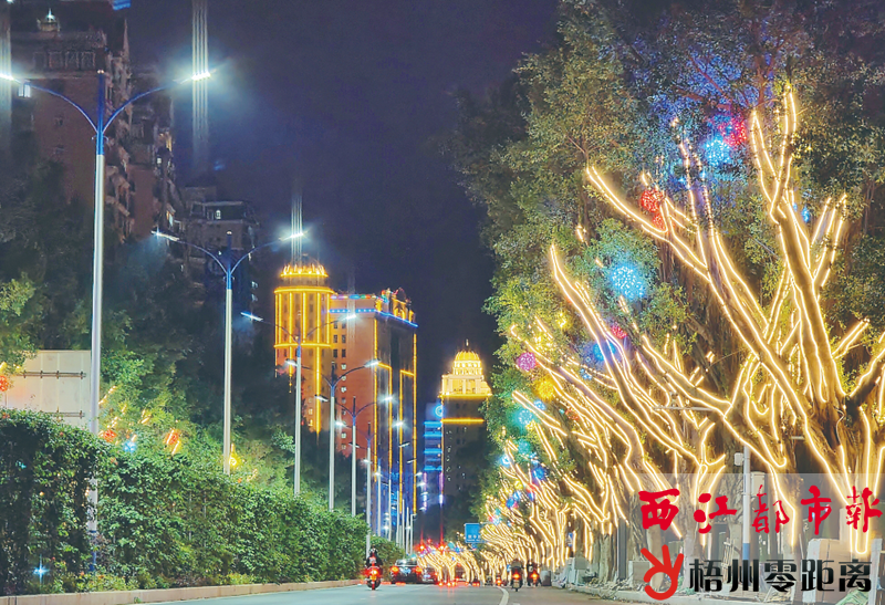 4月25日晚,西堤二路由近及遠皆有燈光夜景可賞。近年來,我市城區燈光亮化提升效果顯著,建筑外立面燈光與西堤路行道樹燈光交相輝映,給行人以美的享受。西江都市報記者 陳凡 攝
