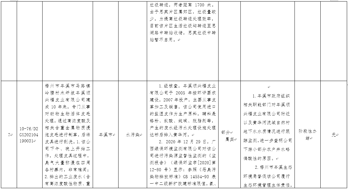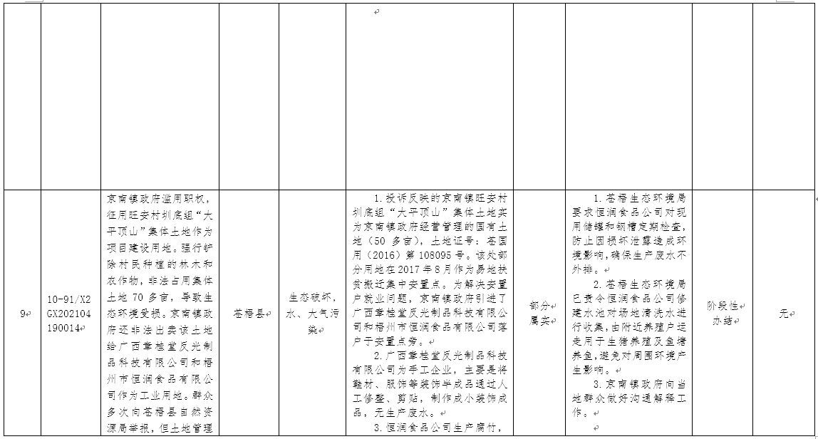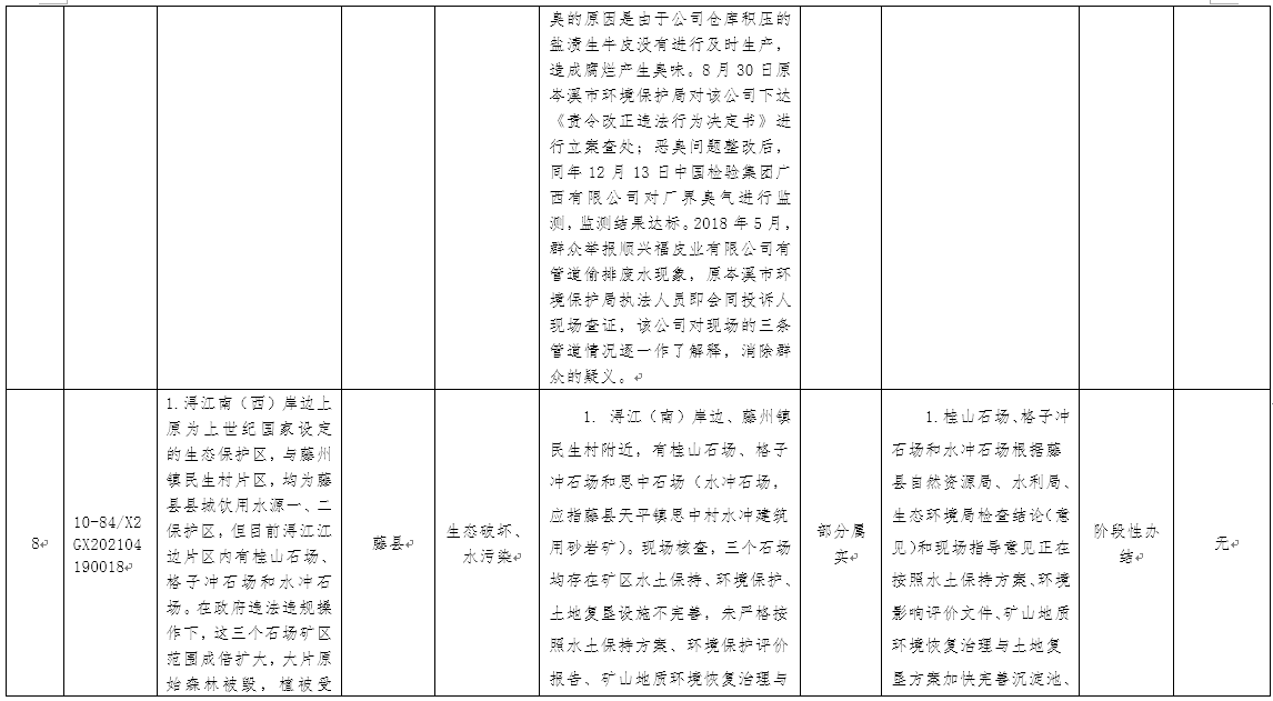 4月20日,中央第七生態環境保護督察組向梧州市交辦第十批群眾舉報案件共9件。梧州市委、市政府高度重視,第一時間明確責任承辦單位,并開展調查處理及整改工作。現將第十批9件群眾舉報案件調查處理情況通報如下: