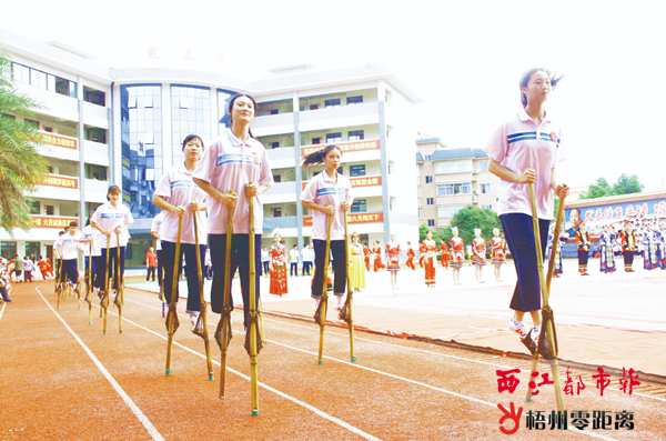 近日,蒙山縣第一中學舉行民族傳統體育展演活動,有舞獅、武術、竹竿舞、踩高蹺、打陀螺、大象拔河、騎毛毛蟲、穿板鞋等項目,集民族性和趣味性為一體,充分展示民族傳統體育運動的風采。江永錄 攝