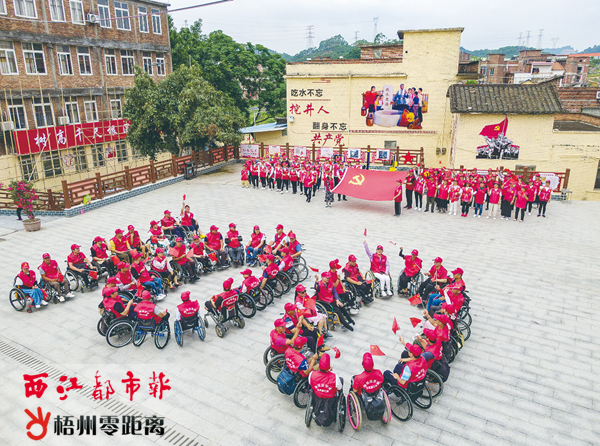 在第31個全國助殘日,殘疾人士齊聚長洲區平浪革命老區廣場,揮舞紅旗放聲歌唱《我和我的祖國》。梧州日報記者 陳凡攝