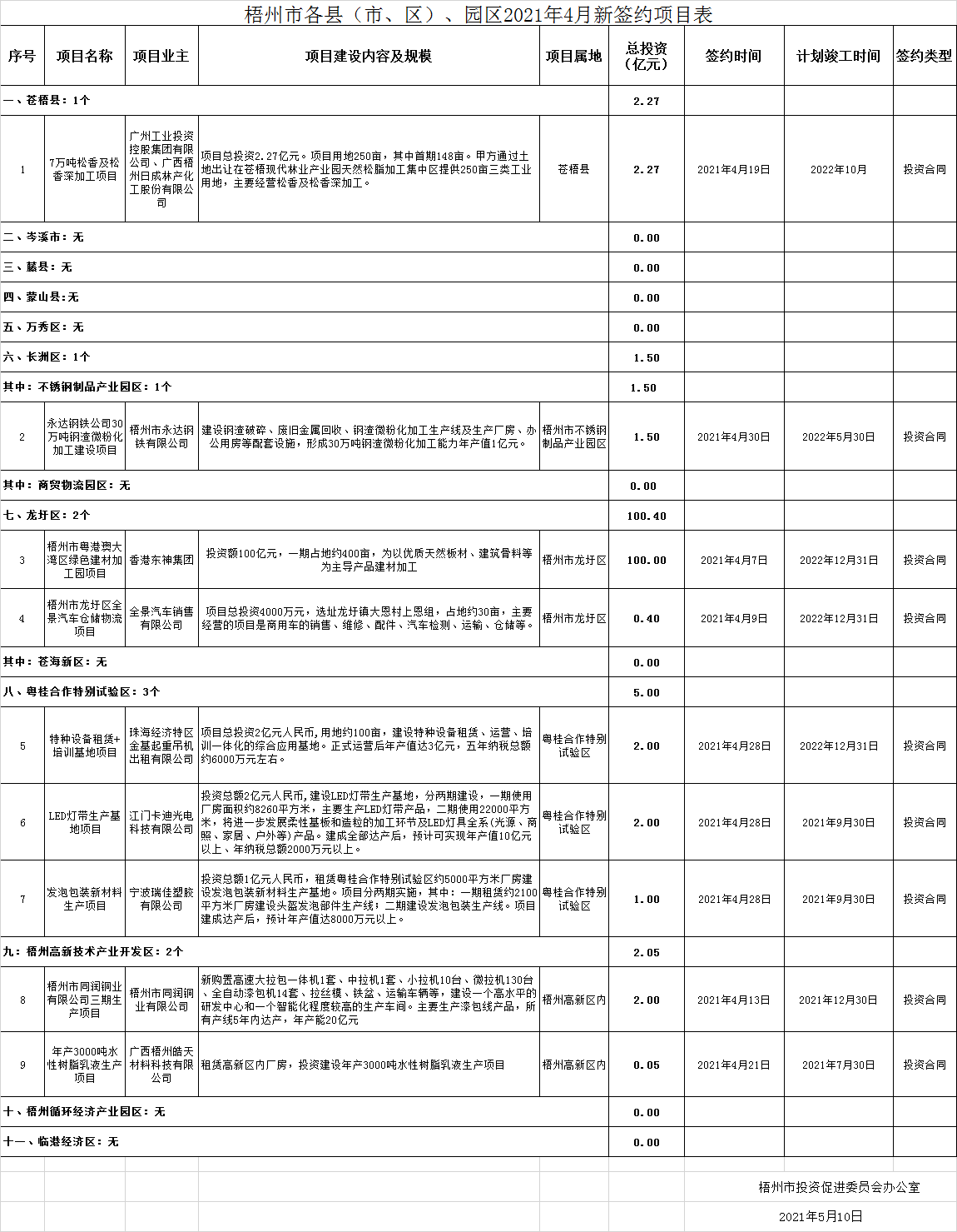 梧州市各縣(市、區)、園區2021年4月新簽約項目表