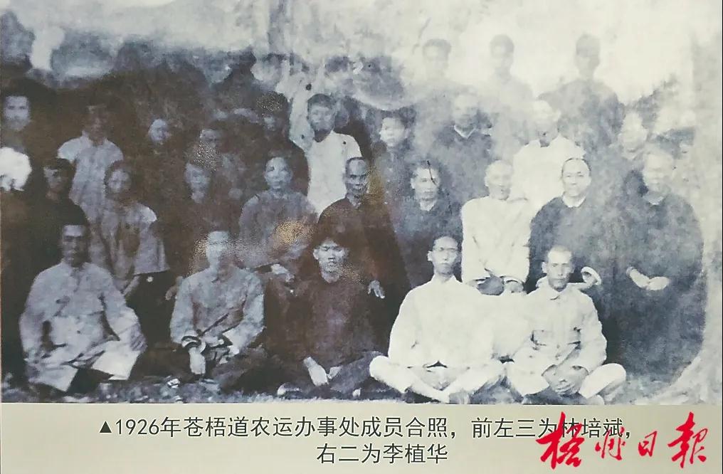 在短短25分鐘的戲劇里,“林培斌”面對(duì)國民黨反動(dòng)派的大義凜然,面對(duì)妻子的愧疚之情,得到了淋漓盡致的展現(xiàn)。通過文藝創(chuàng)作演出這種群眾喜聞樂見的形式,觀眾不僅記住了林培斌的革命事跡和光輝形象,更激起了銘記革命歷史、傳承革命精神的積極性。 1926年蒼梧道農(nóng)運(yùn)辦事處成員合照,前左三為林培斌,右二為李植華(李欣鞠 翻拍)