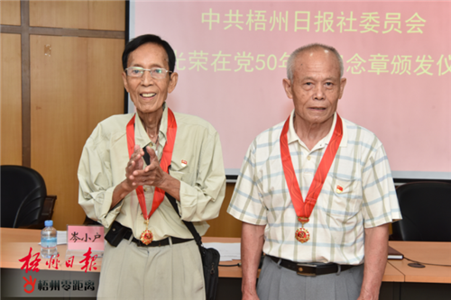 梧州零距離網訊 (記者張超浩)今天(6月22日)上午,梧州日報社“光榮在黨50年”紀念章頒發儀式在梧州日報社13樓新聞發布中心舉行,梧州日報社黨委書記、社長林敏華,梧州日報社黨委副書記、總編輯肖苗生分別為獲得紀念章的梧州日報社老黨員頒發、佩戴“光榮在黨50年”紀念章。