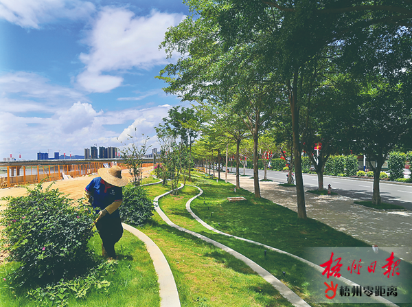 據悉,西堤路濱江一側景觀綠化提升工程是河西防洪堤升級改造項目之一,改造長度約3.88公里,主要設計為綠地景觀帶、各路口綠化節點、休閑空間等場地,目前已建成300多米樣板示范路段,種植多種花卉植被,其余堤段正在加快平整地面施工。梧州日報 記者 李鴻榮 攝