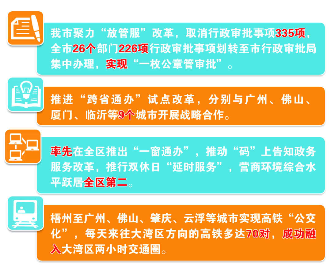 中國共產黨梧州市第十三次代表大會勝利召開以來,我市緊緊圍繞國家、自治區關于深化“放管服”改革、優化營商環境的決策部署,把堅定不移實施“東融”戰略,全面對接粵港澳大灣區,進一步深化改革、擴大開放作為我市實現高質量發展的關鍵之舉。 一步一腳印,邁步新臺階。全市黨員干部職工用五年時間奮力推進各項改革工作,形成了一批具有梧州特色的改革亮點:一枚印章管審批、一站式服務、跨省通辦、最多跑一次……如今的梧州,正以飽滿精神、務實作風、奮發干勁邁步新征程。 強化頂層設計 “堅定信心,乘勢而上,奮力前行!”在剛剛閉幕的全市年中工作會議上,市委書記蔣連生的講話擲地有聲——凝心聚力抓好“東融”開放工作,著力強通道、建平臺、暢循環,以高水平開放引領高質量發展。 我市把全面深化改革作為推進整體工作的金鑰匙,牢牢把握改革方向。市委全面深化改革委員會領銜推進重大改革任務落實制度,建立健全“兩規則一細則”,搭建較為完善的改革工作框架和運行規則,確保改革工作政令暢通,運轉順暢。 一場場座談碰撞思想,一次次調研走向基層,一個個會議凝聚共識……改革發展立柱架梁,廣大干部群眾同心使勁,同向發力,一大批具有深遠意義的改革措施落地見效,一大批有利于構建新發展格局的改革步驟持續推進,一大批重大改革試點走向深入,各領域改革主題框架日益明朗。 2018年以來,全市累計召開近50次市委常委會會議,研究提升做實珠江—西江經濟帶、貫徹自治區黨委賦予我市新定位新要求等課題,先后出臺了《關于毫不動搖實施“東融”戰略的決定》《梧州全面對接粵港澳大灣區加快珠江—西江經濟帶建設實施方案(2019—2021年)》《關于進一步提高梧州“東融”開放發展水平的方案》等政策。 五年里,我們用產業興市、作風興市的實招,破解機關單位痼疾—— 門難進?深化改革! 臉難看?作風興市! 事難辦?擴大開放! 我市聚力“放管服”改革,取消行政審批事項335項,全市26個部門226項行政審批事項劃轉至市行政審批局集中辦理,實現“一枚公章管審批”。率先在全區推出“一窗通辦”,推動“碼”上告知政務服務改革,推進“跨省通辦”試點改革,分別與廣州、佛山、廈門、臨沂等9個城市開展戰略合作,簽訂政務服務“跨省通辦”協議,推行雙休日“延時服務”,營商環境綜合水平躍居全區第二,發展的內生動力不斷增強。 五年里,我們強力推進基礎建設,探索推進“水公鐵空”多式聯運,樞紐門戶城市功能日益完善——我市建成高速公路227公里,梧州南站動車組實現“公交化”運營,西江機場通航全國10個城市,長洲水利樞紐船閘過貨量突破1.5億噸大關,梧州口岸進出口整體通關壓縮時間在廣西內河口岸排名第一。全市實施農村電網改造項目4228個,建成城鎮天然氣管網400公里。 事好辦了,路通暢了,黨群聯系更緊密了!我市大力推行深化改革,從制約經濟社會發展最突出的問題改起,從群眾最期盼的領域改起,從社會各界能達成共識的環節改起。隨著一批批綜合改革實施方案相繼出臺,一項項具有引領作用的重大改革舉措陸續推出,深化改革、擴大開放以破竹之勢,在重要領域和關鍵環節向縱深推進。 找準“東融”突破口 近日,一則僅兩百字的消息被梧州網友廣為轉發——位于粵桂合作特別試驗區的梧州綜合保稅區獲批設立,實現我市國家級園區“零”的突破。這則“字少事大”的重磅消息,激起梧州人民對“東融”開放的熱切期盼。 作為自治區實施“東融”戰略的重點前沿地區,五年里,我市憑借緊鄰粵港澳大灣區的地理優勢,堅持以實施向東開放為重點,充分發揮優勢,加快與大灣區全方位對接,在自治區“東融”戰略中展現梧州作為。 五年里,我市以構建向東通暢大通道格局為著力點,推動一批粵桂互聯互通大通道項目快速建成投用。不僅廣州南沙港至梧州港貨運“穿梭巴士”高效運營,梧州至廣州、佛山、肇慶、云浮等城市也實現高鐵“公交化”,每天來往大灣區方向的高鐵多達70對,成功融入大灣區兩小時交通圈。目前,我市還積極推進柳梧廣高速鐵路、貴港至梧州3000噸級航道工程等項目建設,高效暢通與大灣區的通道。 依托產業鏈融,我市大力推進延鏈補鏈強鏈,以梧州循環經濟產業園區、藤縣中和陶瓷產業園區、蒼海新區等產業園區為載體,打造一批“東融”示范平臺,與大灣區形成更為緊密的產業分工協作關系。截至目前,藤縣中和陶瓷產業園區共入駐知名陶瓷企業21家、配套企業17家,建成生產線131條,成為承接大灣區產業鏈整體轉移的典范。 近兩年來,我市狠抓項目承諾制直接落地改革,全面“東融”更有力。2020年,我市企業投資項目承諾制直接落地改革被自治區列為改革典型經驗在全區推廣。今年,我市進一步拓展改革深度和廣度,低風險項目“先建后驗”,項目“拿地即開工”,全面實施“非禁即入”,實行容缺后補的承諾制審批模式,16個部門建立聯合審批(驗收)快速通道,對工程建設項目審批52項事項實行“一窗式”聯合辦理。通過承諾制改革,目前已推動總投資額超253億元的39個項目快速落地梧州,其中有10個項目在今年上半年走承諾制直接落地,總投資達16.42億元。 圍繞“東融”戰略,我市開放合作體制改革特點突出,建立起人才“東融”機制,推進與廣東地區公共服務共建共享,粵桂合作特別試