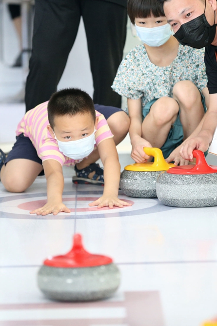 資料圖:2020年9月5日,一名兒童在冬季運動專題展區體驗擲冰壺。新華社記者李明攝
