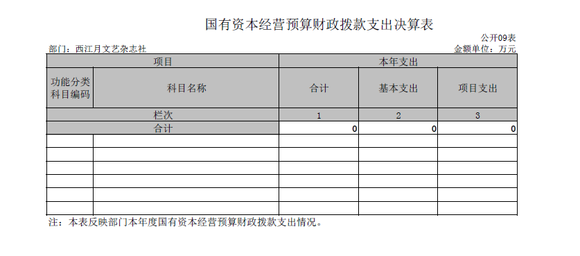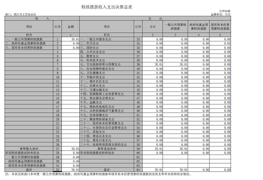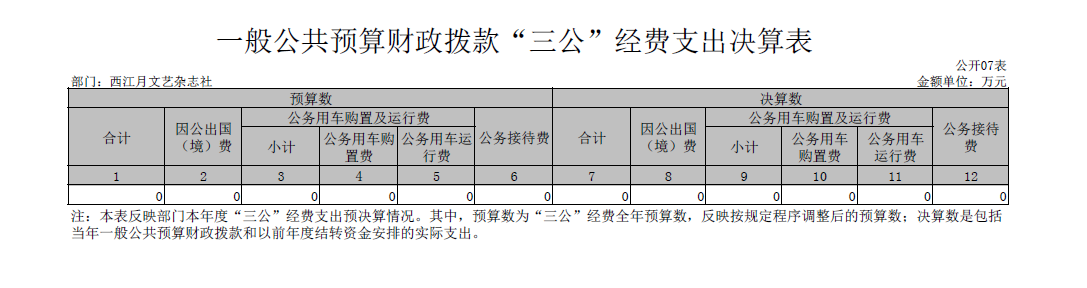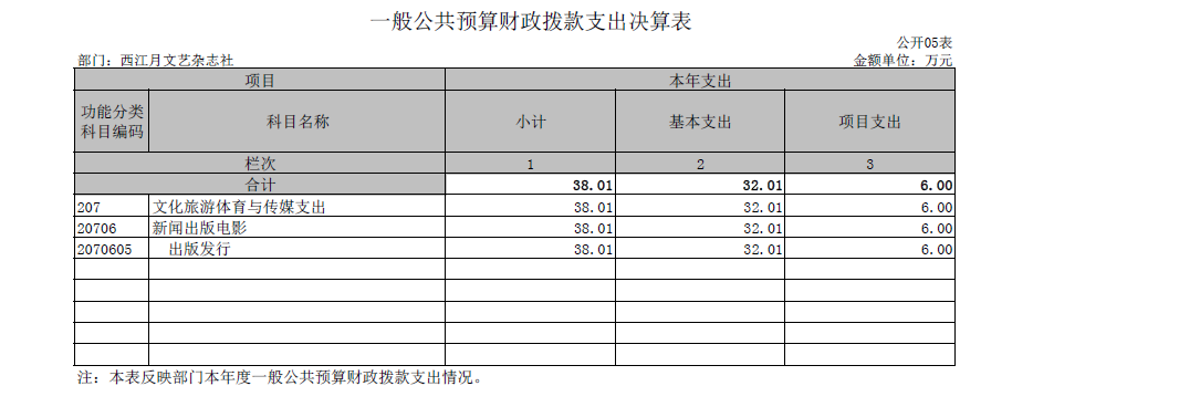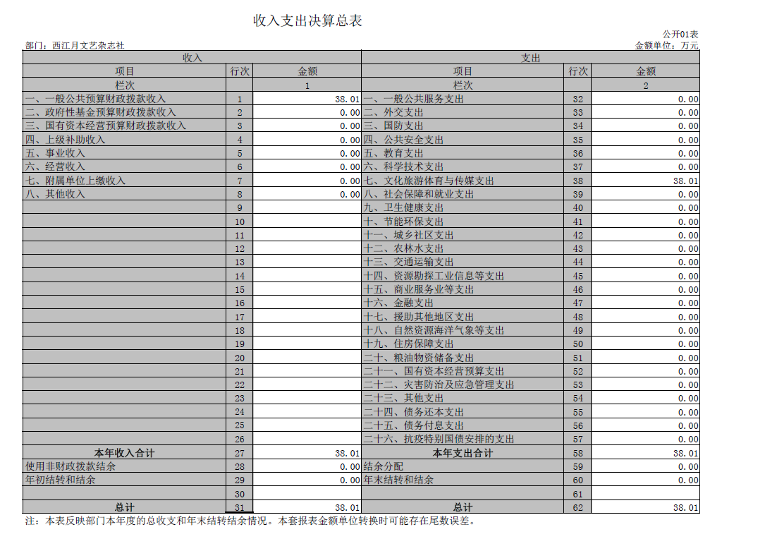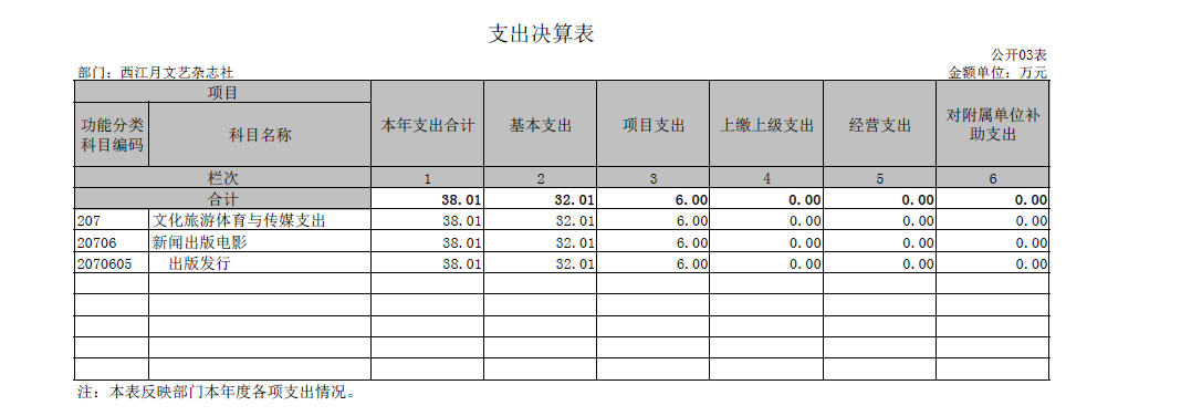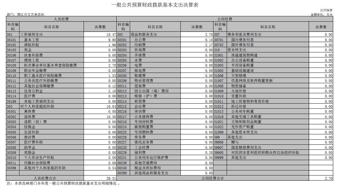 目錄 第一部分:西江月文藝雜志社概況 一、單位職責 二、機構設置 三、編制現狀、人員構成 第二部分:西江月文藝雜志社2020度單位決算報表 表一:收入支出決算總表 表二:收入決算表 表三:支出決算表 表四:財政撥款收入支出決算總表 表五:一般公共預算財政撥款支出決算表 表六:一般公共預算財政撥款基本支出決算表 表七:一般公共預算財政撥款安排的“三公”經費支出決算表 表八:政府性基金預算財政撥款收入支出決算表 表九:國有資本經營預算財政撥款支出決算表 第三部分:西江月文藝雜志社2020年度單位決算情況說明 一、2020年度收入支出決算總體情況 二、2020年度一般公共預算支出決算情況 三、2020年度一般公共預算財政撥款基本支出決算情況說明 四、2020年度政府性基金支出決算情況 五、國有資本經營預算財政撥款支出情況 六、一般公共預算財政撥款安排的“三公”經費支出決算情況說明。 七、其他重要事項情況說明 第四部分名詞解釋 第一部分:西江月文藝雜志社概況 一、單位職責 出版文藝雜志,促進文藝發展?!段鹘隆冯s志出版發行。 二、機構設置 西江月文藝雜志社屬于差額事業單位,內設一個職能科室,編輯部。 三、編制現狀、人員構成 西江月文藝雜志社人員編制總數10名,其中:差額編制10名。其中,在職在編人員3人,包括行政在職在編人員2人,后勤人員1人。離退休人員6人。 第二部分:西江月文藝雜志社2020年度單位決算報表 (此部分另附表格,掛報告尾部) 第三部分:西江月文藝雜志社2020年度單位決算情況說明 一、2020年度收入支出決算總體情況 (一)本單位2020年度總收入38.01萬元,其中本年收入38.01萬元,較2019年度決算數增加6.46萬元,增長20.5%。收入具體情況如下。 1.一般公共預算財政撥款收入38.01萬元,為市本級財政當年撥付的資金。較2019年度決算數增加6.46萬元,增長20.5%,基本支出增加的主要原因人員工資基數增加,各項人員經費增加。項目支出增加的主要原因是需印刷《西江月》雜志、印刷費等支出增加。 (二)本單位2020年度總支出38.01萬元,其中本年支出38.01萬元,較2019年度決算數增加6.46萬元,增長20.5%。支出具體情況如下: 1.文化旅游與體育傳媒支出38.01萬元:主要用于基本支出人員的工資福利支出對個人和家庭的補助支出及印刷等日常運轉支出。 較2019年度決算數增加6.46萬元,增長20.5%,基本支出增加的主要原因人員工資基數增加,各項人員經費增加。項目支出增加的主要原因是需印刷《西江月》雜志、印刷費等支出增加。 二、2020年度一般公共預算財政撥款支出決算情況 西江月文藝雜志社2020年度一般公共預算財政撥款支出38.01萬元,較2019年度決算數增加6.46萬元,增長20.5%。其中:基本支出32.01萬元,項目支出6萬元。 西江月文藝雜志社2020年度一般公共預算財政撥款支出年初預算為31.77萬元,支出決算為38.01萬元,完成年初預算的119.6%。 (一)文化旅游與體育傳媒支出年初預算為31.77元,支出決算為38.01萬元,完成年初預算的119.6%。主要是人員工資基數增加,各項人員經費增加。項目支出增加的主要原因是需印刷《西江月》雜志、印刷費等支出增加。 出版發行38.01萬元,主要用于人員工資支出、《西江月》雜志稿費支出及印刷支出等。較年初預算數增加6.24萬元,主要是人員工資基數增加,各項人員經費增加。項目支出增加的主要原因是需印刷《西江月》雜志、印刷費等支出增加。 三、2020年度一般公共預算財政撥款基本支出決算情況說明 2020年度一般公共預算財政撥款基本支出32.01萬元,比上年增加0.46萬元,增長1.5%,主要是人員工資支出增加。 其中:人員經費29.31萬元,主要包括:基本工資、津貼補貼、對個人和家庭補助等;公用經費2.7萬元,主要包括:辦公費、印刷費等。 支出具體情況如下: 工資福利支出18.47萬元,完成年初預算的133.8%。主要是人員工資基數調增,社會保險費用繳納基數調增。 商品和服務支出2.7萬元,完成年初預算的100%。 對個人和家庭的補助10.84萬元,完成年初預算的100%。 四、2020年度政府性基金支出決算情況 本單位無政府性基金收入,也沒有政府性基金支出,與去年相比無變化,與預算相比無變化。 五、國有資本經營預算財政撥款支出情況說明 本單位無國有資本經營預算財政撥款收入,也沒有國有資本經營預算財政撥款支出,與去年相比無變化,與預算相比無變化。 六、一般公共預算財政撥款安排的“三公”經費支出決算情況說明 2020年度一般公共預算財政撥款安排的“三公”經費支出決算中,因公出國(境)費支出決算0萬元;公務用車購置及運行費支出決算0萬元;公務接待費支出決算0萬元。 2020年度一般公共預算財政撥款安排的“三公”經費支出決算總額為0萬元,與預算同比無變化,與去年相比無變化。其中,因公出國支出決算與預算同比無變化,與去年相比無變化。公務用車購置支出決算與預算同比無變化,與去年相比無變化。公務用車運行維護費決算支出與預算同比無變化,與去年相比無變化。公務接待費支出決算與預算相同無變化,與去年相比無變化。具體情況如下: (一)因公出國(境)費支出0萬元。全年使用財政撥款安排0個(局、辦)機關、0個所屬單位出國團組0個,參加其他單位組織的出國團組0個,全年因公出國(境)團組共計0個,累計0人次。 (二)公務用車購置及運行費支出0萬元。其中: 公務用車購置支