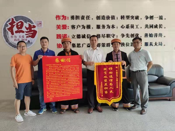六洛村村民到蒙山移動分公司送感謝信和錦旗。梧移 攝 “村里有了通信網絡以后,我們的農產品銷路更寬了。”自從蒼梧縣六堡鎮高枧村直放站開通以來,當地群眾對通信暢通帶來的便利感受頗深。 這些,都是中國移動廣西公司梧州分公司在推進電信普遍服務試點項目中所取得成效的縮影。此前,位于連綿大山深處的獅寨鎮島朝村,由于附近山高遮擋通信信號,均無運營商網絡,村民們需爬到半山才能收到微弱的2G信號;蒙山縣夏宜鄉六洛村也因地處山區,村屯分散,交通、通信等基礎設施十分落后,整個六洛村均無運營商網絡覆蓋,無法使用手機與外界聯系;而四面環山的高枧村也無通信運營商網絡,當地群眾種植的六堡茶等農產品,由于通信不暢、交通不便一度賣不出去,不利于經濟發展。 想群眾之所想,急群眾之所急,近年來,中國移動廣西公司梧州分公司將助力脫貧攻堅、鄉村振興與基層黨建有機結合起來,以“黨建和創”主題實踐活動為紐帶,積極開展網絡+扶貧、信息扶貧、愛心扶貧項目,持續推進電信普遍服務試點項目,持續完善偏遠山區的通信基礎設施。該公司組建專門的網絡建設攻堅突擊隊,頻頻深入山區現場勘查,制定可行性強的建設方案,克服山路崎嶇、施工難度大等困難,快馬加鞭建設,將建設周期壓縮至最短,確保基站第一時間開通。“十三五”期間,中國移動廣西公司梧州分公司累計完成168個電信普遍服務項目行政村網絡覆蓋。(楊捷焱) |