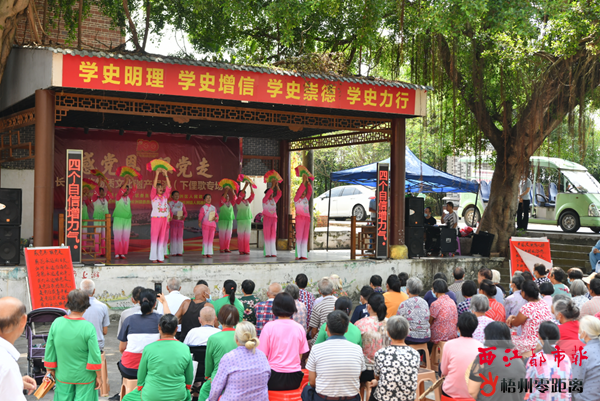 當(dāng)天,長洲區(qū)在泗洲村舉行“感黨恩跟黨走”下俚歌展演專場。泗洲村村民用當(dāng)?shù)靥赜械南沦蹈瑁Y(jié)合黨史學(xué)習(xí)教育,編排了多個文藝節(jié)目,向村民宣傳黨史知識,以及我市在黨史學(xué)習(xí)教育中取得的成果。梧州日報記者 李鴻榮 攝