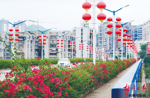 中秋節(jié)臨近,市區(qū)多個路段寶巾花開放。桂江二橋上,花開正盛的寶巾花與紅燈籠造型的路燈相互映襯,增添節(jié)日氛圍。