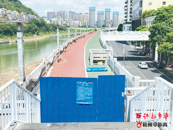梧州零距離網-西江都市報訊(記者 黃子萃)近日,有市民在萬秀區桂江一橋往龍母廟方向的河東防洪堤行走時,發現部分上下防洪堤的樓梯被封閉而不得不走“回頭路”。市民希望施工單位能在各個入口處設置提示標志,免得市民走“冤枉路”。對此問題,市水利局方面回應稱,目前河東防洪堤堤頂全線封閉施工。