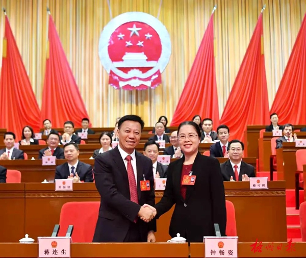 市委書記蔣連生和鐘暢姿同志親切握手,祝賀她當選新一屆市人民政府市長。記者 李鴻榮 攝