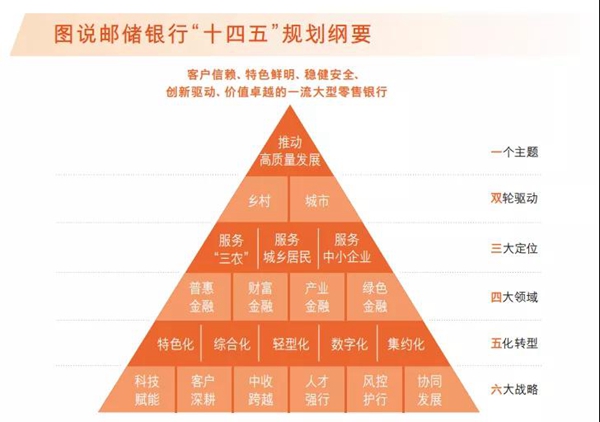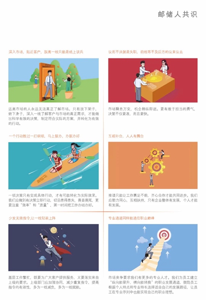 圖片來源:郵儲銀行2021年半年度報告 中國郵政儲蓄可追溯至1919年開辦的郵政儲金業務,“普惠”與“穩健”的基因在那時起就深植于血脈。“回顧百年郵政金融史,我們無比自豪。”郵儲銀行董事長張金良介紹,“郵儲銀行收集了全行16萬份調查問卷,深入調研走訪,研究標桿企業,提煉出郵儲銀行的企業文化。”可以說,這套文化體系既傳承百年郵儲的文化基因,又具有前瞻視角,凝聚了歷代郵儲人的智慧和汗水,承載了新一代郵儲人的期許和理想。