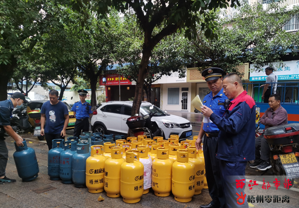 當天,市城市管理執法支隊會同市燃氣管理處、長洲區市場監管局等部門依法查處該店無證經營燃氣行為,現場查扣41瓶15公斤裝的液化石油氣。梧州日報 記者 吳艷虹 攝