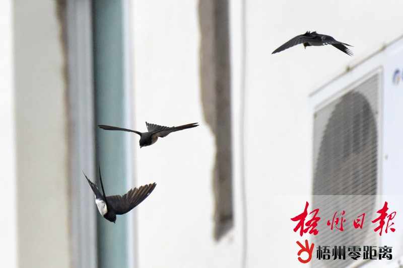 梧州零距離網-西江都市報訊 (記者 陳益銘)近日,有市民反映稱,在梧州市文瀾路公交站附近一帶,出現成群結隊的燕子在低空盤旋飛舞,燕子們不停發出嘰嘰喳喳的叫聲。