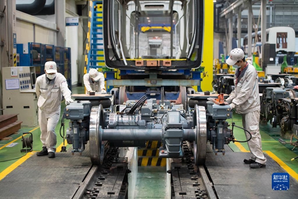 工作人員在位于湖南省株洲市的中車株機城軌事業部總成車間工作(2020年4月28日攝)。新華社記者陳思汗攝