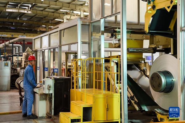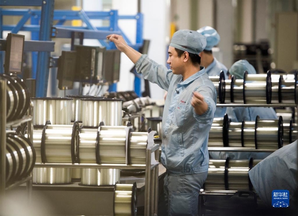 在位于山西省太原市的太鋼不銹鋼精密帶鋼公司,工人在操控寬幅精密帶鋼箔材的加工設備(2020年7月19日攝)。新華社記者曹陽攝