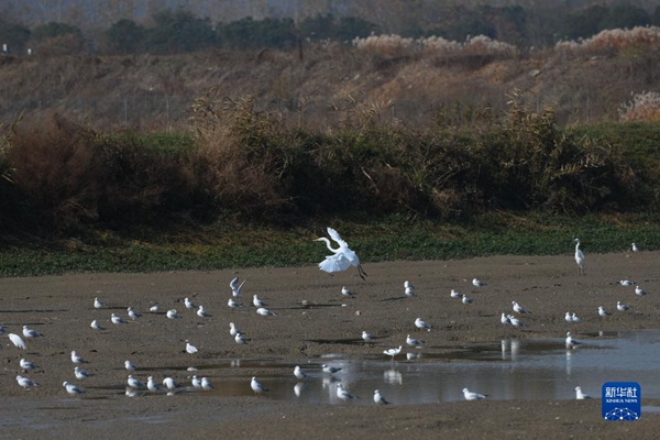 這是2019年11月22日拍攝的安徽巢湖邊一處鳥類翔集的濕地。新華社記者張端攝