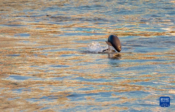 江豚在湖北省宜昌市西陵區鎮江閣外逐浪嬉戲(2020年8月3日攝)。新華社發(雷勇攝)