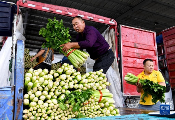 在位于河南省鄭州市中牟縣的河南萬邦國際農產品物流城,工作人員在搬運蔬菜(2021年7月22日攝)。新華社記者郝源攝