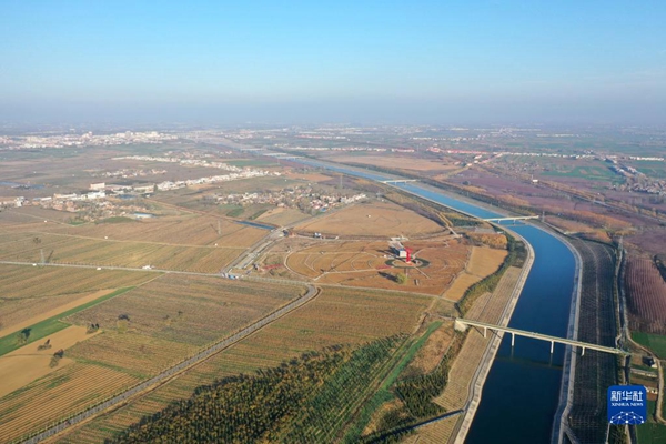 這是2019年12月9日拍攝的河南省南陽市淅川縣九重鎮張河村仁和康源軟籽石榴基地,南水北調中線工程干渠從田間穿過(無人機照片)。新華社記者馮大鵬攝