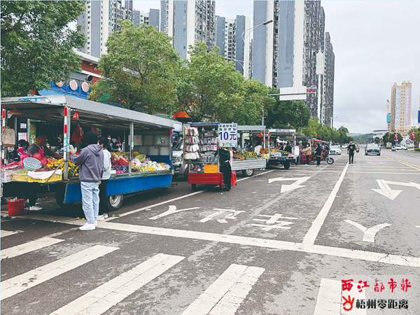 梧州零距離網-西江都市報訊(記者 鐘慧)近日,有市民向本報反映,長洲區三龍大道梧州職業學院門口及周邊出現流動攤販占道經營現象。更讓人擔心的是,部分攤販竟然不顧交通安全直接在機動車道上擺賣。