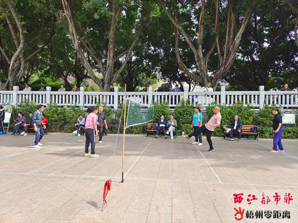 11月15日,一群中老年人在萬秀區角嘴街道潘塘社區全民健身晨(晚)練點進行踢毽子比賽,吸引不少群眾圍觀。