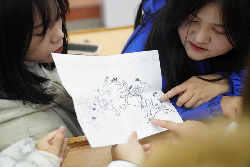 11月11日,長春光華學院視覺藝術設計學院學生在教室內討論創作草稿。
