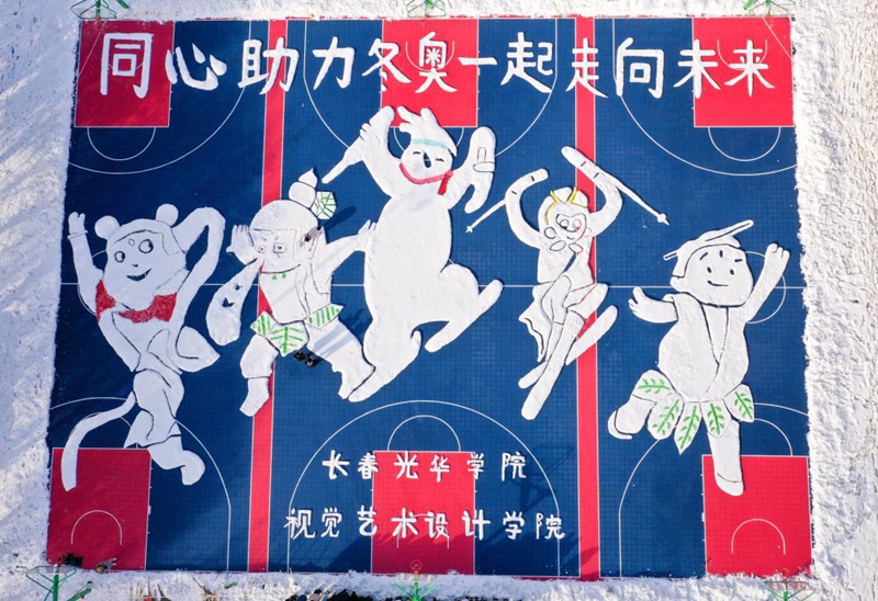 近日,吉林長春迎來降雪天氣。長春光華學院視覺藝術設計學院的一百多名師生利用課余時間在學校籃球場上繪制1680平方米的創意“雪畫”,繪畫以“同心助力冬奧,一起走向未來”為主題,為北京冬奧會助力。