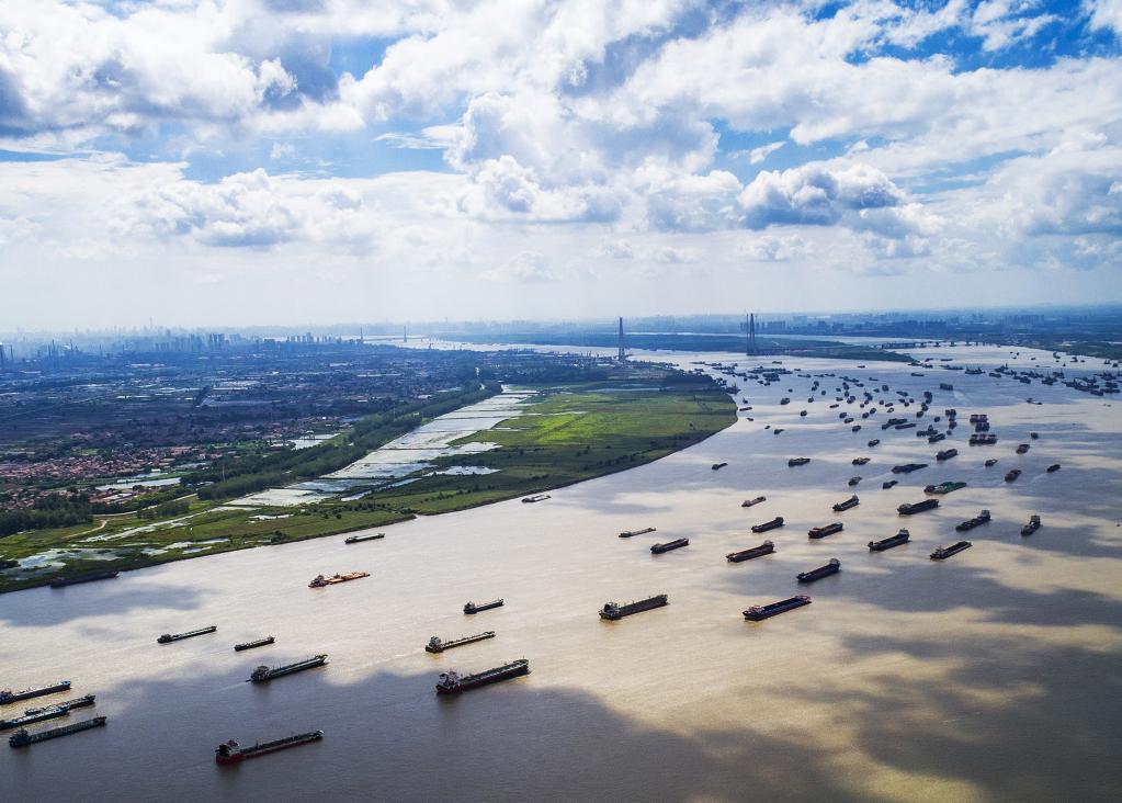 這是2018年8月13日通過無人機(jī)拍攝的船舶在湖北省武漢市陽邏港區(qū)水域行駛。(新華社記者 肖藝九 攝)