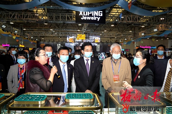 12月3日,出席第十八屆梧州寶石節開幕式的領導嘉賓,到梧州毅德城參觀寶石節系列活動。圖為張曉欽、李振潛等領導嘉賓,在蔣連生、鐘暢姿等市領導陪同下,在展區了解寶玉石飾品的發展前景。記者 楊揚 攝