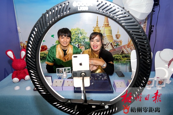 12月3日,網(wǎng)絡(luò)達(dá)人通過(guò)現(xiàn)場(chǎng)探會(huì)展等形式,向網(wǎng)友推介梧州人工寶石產(chǎn)品。記者 楊揚(yáng) 攝