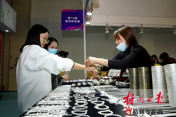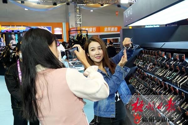 第十八屆梧州寶石節(jié)期間,市民既可以在網(wǎng)上選購(gòu)寶石飾品,也可以到梧州珠寶展現(xiàn)場(chǎng)試戴購(gòu)買。記者 楊揚(yáng) 攝