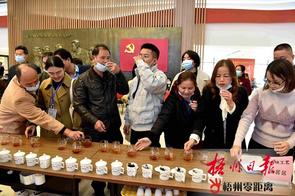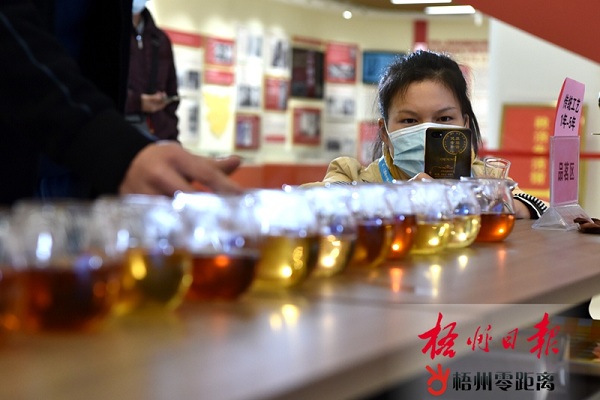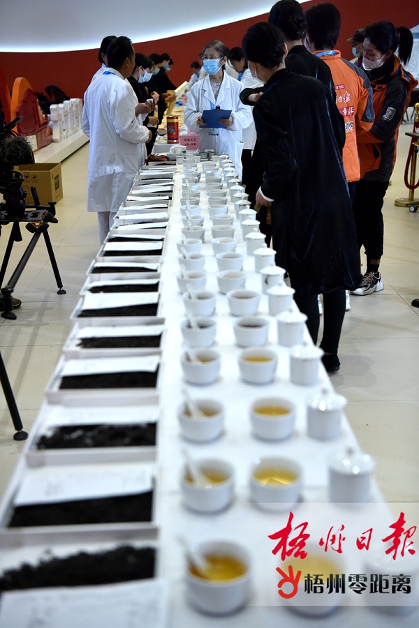 第三屆中國(廣西)六堡茶斗茶大會的參賽茶樣一字排開。記者 何鎏 攝