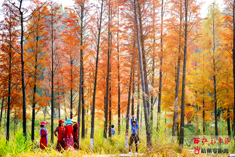 12月12日,市民在蒼海湖的湖邊觀賞水杉。近日,在蒼海湖跨湖橋東側集中種植的大批水杉葉子變紅了。目前,蒼海湖東西兩岸多處岸線的水杉呈現金黃、橘紅等顏色,吸引了大批市民前來游玩。梧州日報 記者 陳凡 攝
