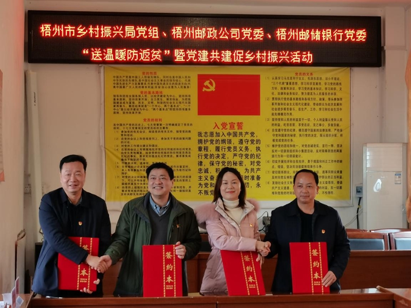 2021年12月30日,梧州市鄉(xiāng)村振興局、郵政梧州分公司、郵儲銀行梧州市分行、岑溪市安平鎮(zhèn)等各單位部門聯(lián)合,到安平鎮(zhèn)中慶村開展“送溫暖防返貧”活動,并對黨建共建活動進(jìn)行簽約儀式。 座談會上,郵儲銀行梧州市分行行長覃延寧就中慶村需要支持協(xié)調(diào)的事項進(jìn)行了解答。覃延寧表示,梧州市分行始終把服務(wù)“三農(nóng)”,服務(wù)鄉(xiāng)村振興作為重點工作來抓,對蒼梧六堡茶、藤縣古龍八角等產(chǎn)業(yè)提供金融支持,助力產(chǎn)業(yè)發(fā)展壯大,為助力鄉(xiāng)村振興奉獻(xiàn)郵儲力量。同時覃行長還詳細(xì)介紹該行“八角流水貸”“六堡茶流水貸”等涉農(nóng)產(chǎn)品。 在簽約儀式后,覃延寧一行到困難群眾家中進(jìn)行慰問,為困難群眾帶來米和油等生活用品,囑咐困難群眾要注意保重身體,相信在大家伙的幫助下,明天會更好。 此時活動,展現(xiàn)了郵儲銀行梧州市分行的責(zé)任與擔(dān)當(dāng),讓郵儲溫度溫暖人心,讓服務(wù)“三農(nóng)”,服務(wù)鄉(xiāng)村振興的理念深入人心。