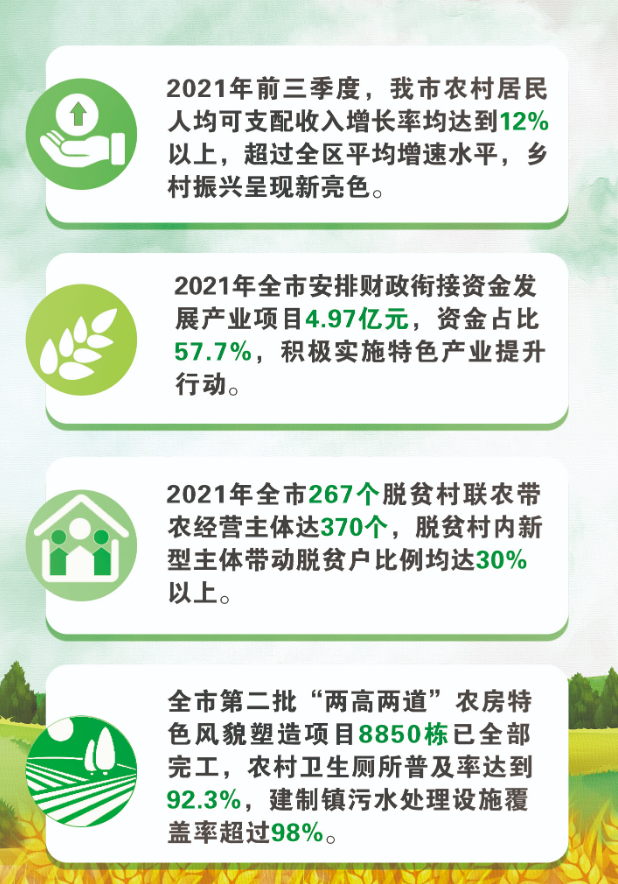因此,去年以來,市委、市政府持續(xù)發(fā)揚“上下同心、盡銳出戰(zhàn)、精準(zhǔn)務(wù)實、開拓創(chuàng)新、攻堅克難、不負(fù)人民”的脫貧攻堅精神,乘勢而上,加強頂層設(shè)計,堅持農(nóng)業(yè)農(nóng)村優(yōu)先發(fā)展戰(zhàn)略,不斷鞏固拓展脫貧攻堅成果同鄉(xiāng)村振興有效銜接,推動鄉(xiāng)村振興與縣域經(jīng)濟(jì)高質(zhì)量發(fā)展有效融合,促進(jìn)城鄉(xiāng)互補、協(xié)調(diào)發(fā)展、共同繁榮,全力繪就“三農(nóng)”新畫卷。
