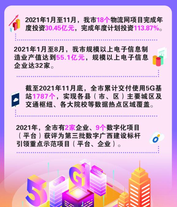 近年來,我市深入實施大數據戰略,大力推進數字基礎設施建設。截至2021年11月底,全市累計交付使用5G基站1787個,實現各縣(市、區)主要城區及交通樞紐、各大院校等數據熱點區域覆蓋;忠德粵桂大數據產業基地正朝著打造廣西技術領先的云數據中心和超算中心的目標加快工程推進……依托數字基礎設施,統一的政務服務數字化底座進一步打牢,初步形成以“壯美廣西·梧州云”“梧州市電子政務外網”“廣西數字政務一體化平臺 (梧州)”等組成的“七個一”基本架構。