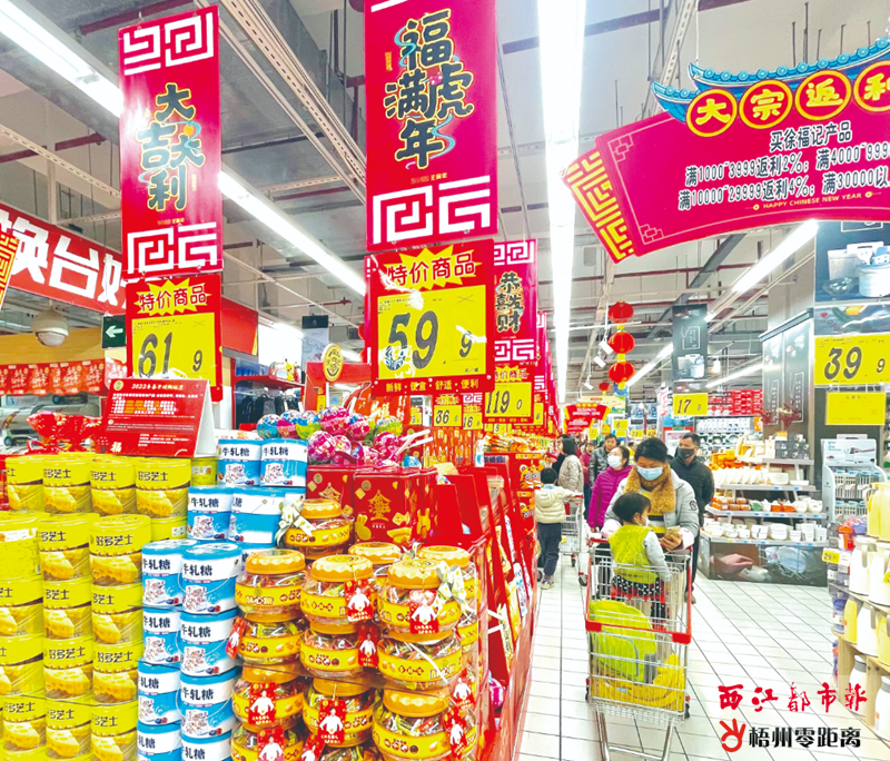 1月10日,我市大學路一家大型超市內,市民正在選購新春飾品和年貨。臨近春節,各大商超的節日氣氛越來越濃,市民紛紛采購年貨。紅包、燈籠、對聯等節慶用品琳瑯滿目,糖果餅干、粽子等傳統新春食品備受市民青睞。梧州日報 記者 楊揚 攝