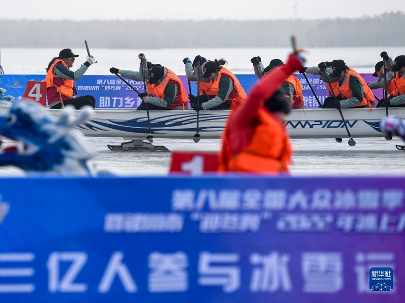 1月8日,市民在冰封的閱海湖面上參加冰上龍舟比賽。