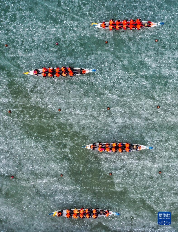 1月8日,市民在冰封的閱海湖面上參加冰上龍舟比賽(無人機照片)。