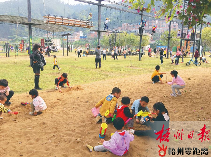 軍博園內(nèi),“叢林探險”“六人座式飛行器”“蟒蛇籠”等戶外拓展項目林立,由木樁、鐵架、輪胎等材料搭建而成的項目設(shè)施很吸引眼球。孩子一見到新奇有趣的設(shè)施,就會挪不開腳步,忍不住向前攀高爬低地玩。此外,軍博園內(nèi)還有沙池,一片小小沙池就能成為孩子發(fā)揮無限創(chuàng)意的廣闊天地。