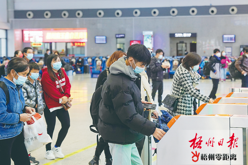 1月17日,旅客們做好防疫措施,在梧州南站有序過閘進站乘車。記者 楊揚 攝