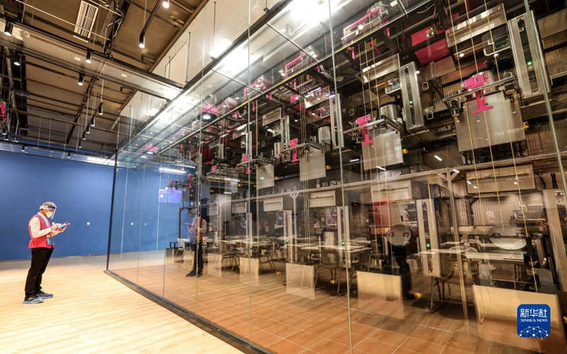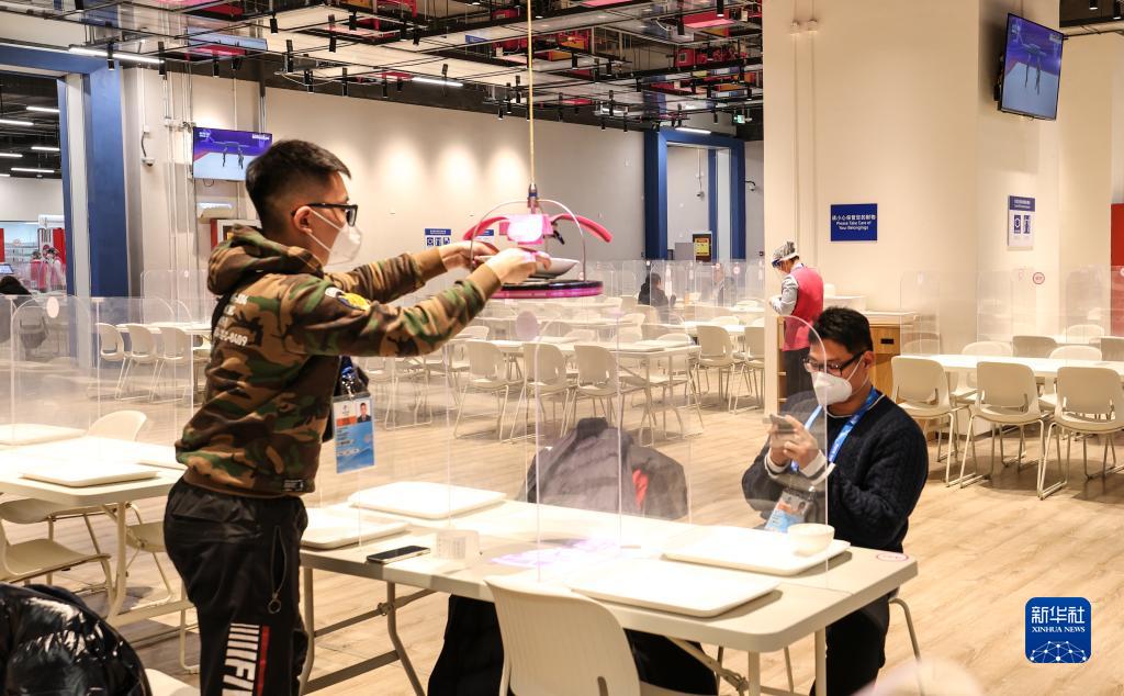 1月26日,一名工作人員正在主媒體中心媒體餐廳查看運菜機器人工作。