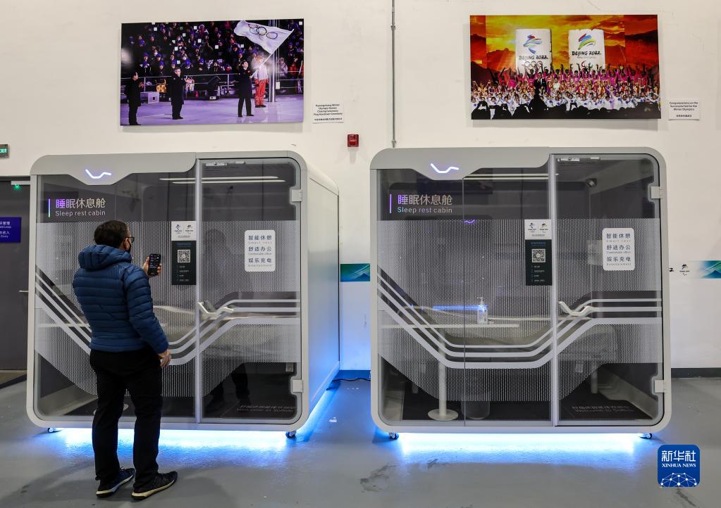 1月26日,一名外國記者正在主媒體中心了解“睡眠休息艙”使用方法。