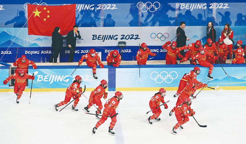 2月6日,中國(guó)隊(duì)球員慶祝勝利。當(dāng)日,在五棵松體育中心舉行的北京2022年冬奧會(huì)女子冰球小組賽中,中國(guó)隊(duì)以2比1戰(zhàn)勝日本隊(duì)。新華社記者 李尕 攝