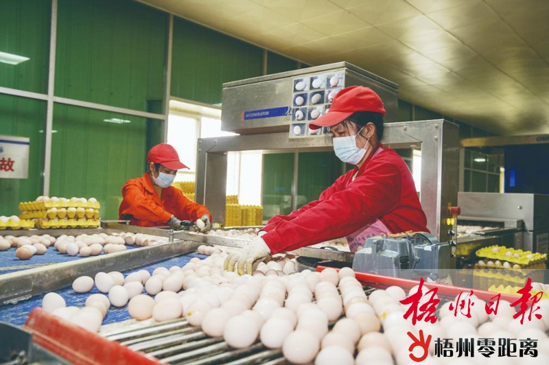 2月16日,龍圩區大坡鎮勝洲蛋雞場生產車間內,工作人員正在忙碌地分揀雞蛋。