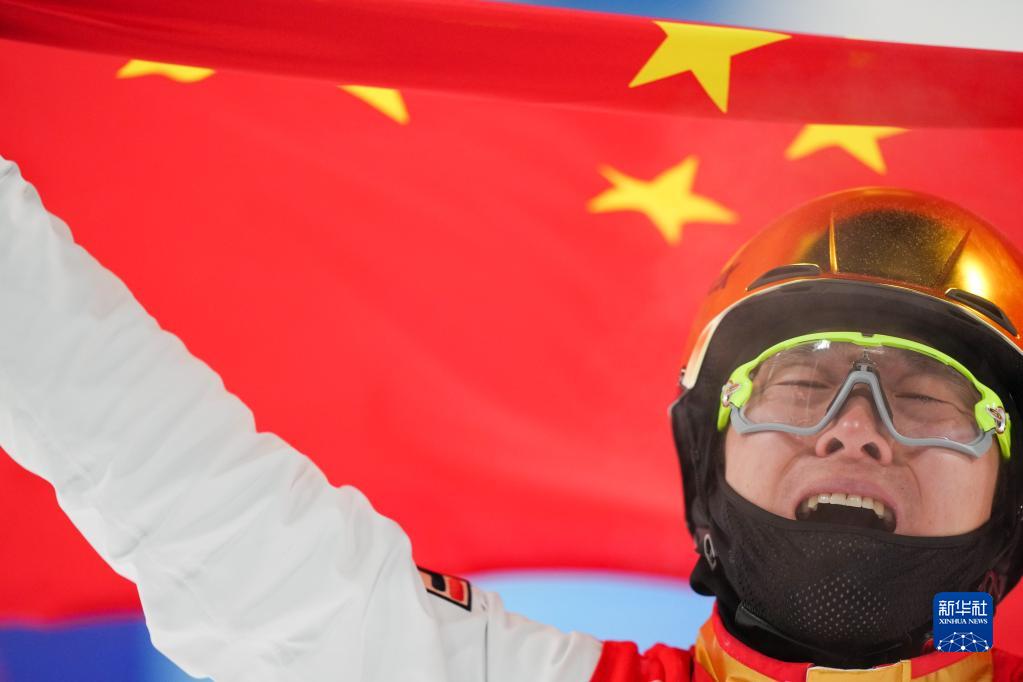 2月16日,北京冬奧會(huì)自由式滑雪男子空中技巧決賽,中國(guó)選手齊廣璞獲得冠軍后慶祝。新華社記者薛玉斌攝