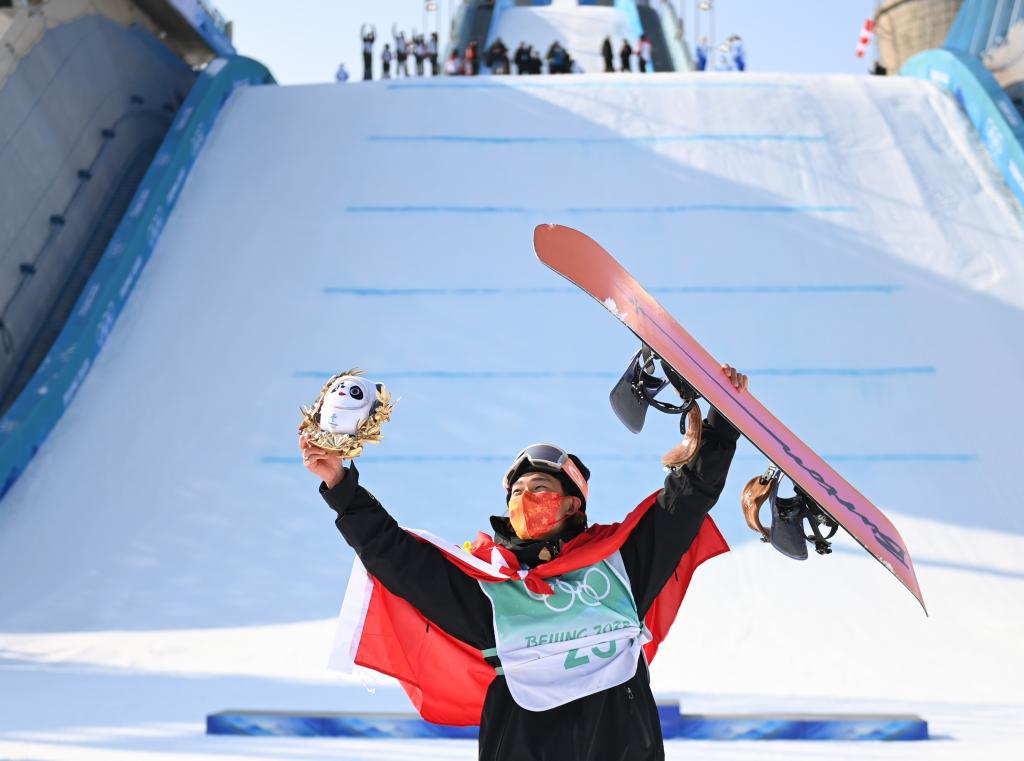 2月15日,蘇翊鳴在北京冬奧會單板滑雪男子大跳臺決賽奪冠后慶祝。新華社記者黃宗治攝